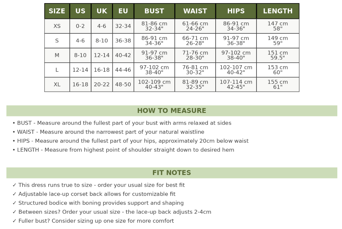 Fit: Fitted corset bodice with structured boning, flowing pleated maxi skirt. Adjustable lace-up back for customizable fit.